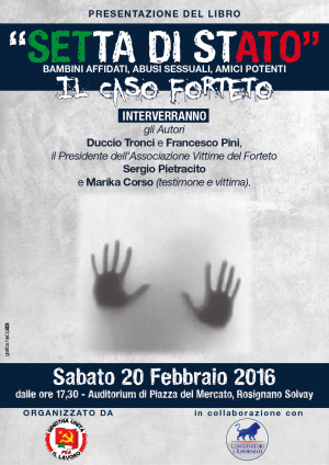 Il gruppo consiliare SUL, in collaborazione con i Conservatori e Riformisti, organizza per il giorno 20febbraio, ore 17,30, presso l’Auditorium di piazza del Mercato, la presentazione del libro “Setta di Stato”, sul caso Forteto.