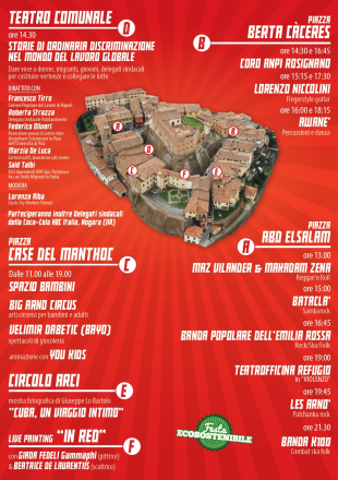 - “Piazza Abd El Salam” dedicata ai concerti, alla pittura sociale dal vivo e ad interventi dei rappresentanti di comitati e soggetti collettivi impegnati a difesa dei beni comuni, ma anche di delegati di fabbriche e di movimenti che sostengono le lotte per i diritti sociali ed il lavoro;