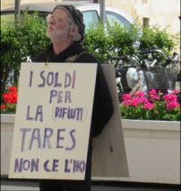 Singolare protesta davanti al Comune, con un cartello sandwich perché non ha soldi per pagare la Tares (la tassa sui rifiuti urbani).