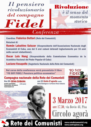 A partire dal 27 febbraio a Milano – Roma – Pisa- Napoli – Bologna inizierà la seconda campagna nazionale della Rete dei Comunisti ”Il pensiero rivoluzionario del compagno FIDEL” con conferenze internazionali di Ramon Labañino Salazar (uno dei 5 eroi cubani prigionieri per 16 anni nelle carceri statunitensi) e Luciano Vasapollo (Segreteria nazionale della Rete dei Comunisti). Riunioni nazionali con centri studi e strutture universitarie, con organizzazioni politiche comuniste e del sindacalismo di classe conflittuale, e incontri in varie città con strutture della solidarietà internazionalista e feste con musica, cene cubane.