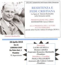 1945-2015 settantesimo anniversario della Liberazione in Resistenza e fede cristiana, la figura di Dietrich Bonhoeffer nella Germania nazista presentazione del libro Bonhoeffer (Carocci editore) alla presenza dell’Autore Fulvio Ferrario, docente di teologia sistematica e decano della Facoltà valdese di teologia valdese a Roma e ne è l’attuale decano. E’ un esperto di livello europeo non solo sulla figura di Bonhoeffer, impegnato pure nel movimento ecumenico per l’unità dei cristiani.