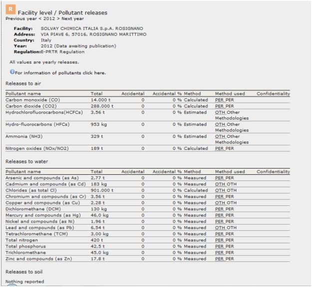 Dati provenienti dal Registro ufficiale dell’Unione europea, relativi all’anno 2012. (http://prtr.ec.europa.eu/FacilityDetails.aspx?FacilityId=5150&ReportingYear=2012)
