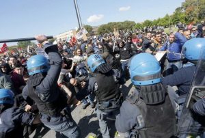 carica della polizia sui manifestantiAll’interno dell’auditorium del Cnr dove si svolge la celebrazione, mentre noi giornalisti ascoltiamo i vari interventi,  sugli smartphone e tablet via Internet viaggiano notizie e immagini dei disordini della manifestazione di protesta, che si verificano ai cancelli del Centro ricerche, nella zona blindata da centinaia di poliziotti e carabinieri in tenuta anti sommossa, le principali strade d’accesso chiuse al traffico, di oltre 600 persone che scandivano slogan contro il governo.