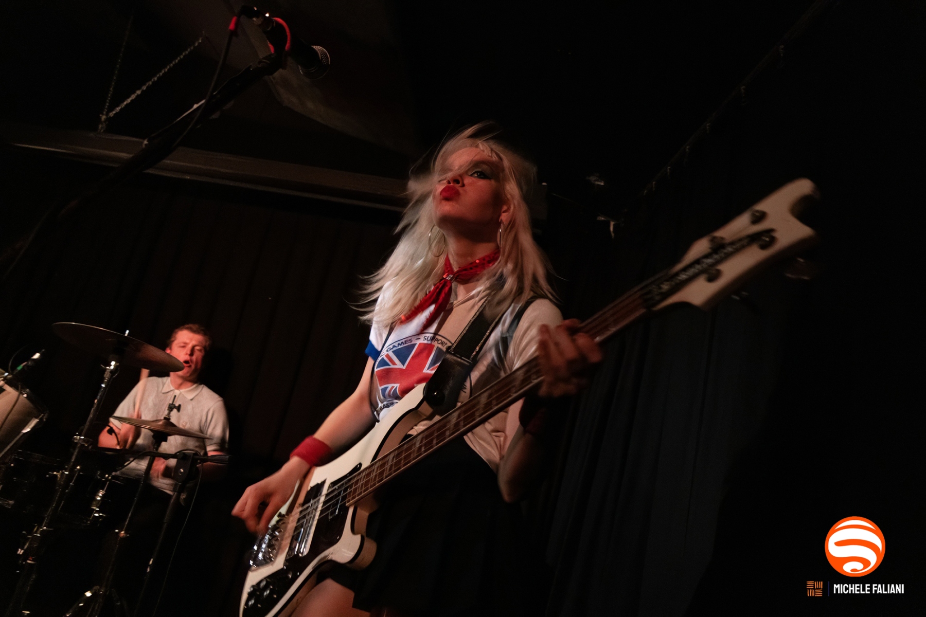 Sul palco, i fratelli non deludono. Matthew, con la sua camicia à la Paul Weller del periodo Jam, suona la chitarra con rabbia, si scontra con i muri della minuscola scena e maltratta un microfono troppo debole per la sua furia. È il classico “lad” inglese, nervi e riff. Issey, con abito e stivali rossi da pin-up e uno sguardo magnetico, brandisce il suo basso Rickenbacker con una sicurezza da veterana. Una coppia che non ha solo il look, ma l’attitudine rock’n’roll in formato XXL.