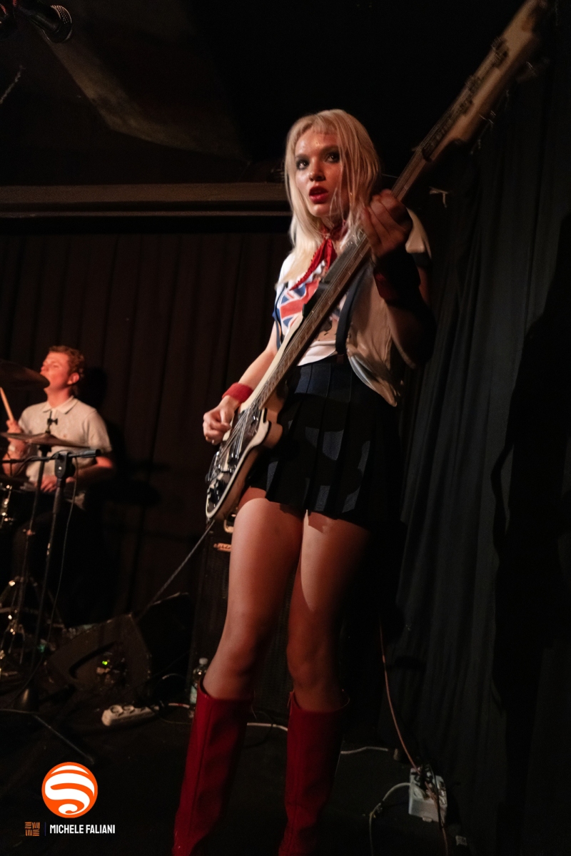 Sul palco, i fratelli non deludono. Matthew, con la sua camicia à la Paul Weller del periodo Jam, suona la chitarra con rabbia, si scontra con i muri della minuscola scena e maltratta un microfono troppo debole per la sua furia. È il classico “lad” inglese, nervi e riff. Issey, con abito e stivali rossi da pin-up e uno sguardo magnetico, brandisce il suo basso Rickenbacker con una sicurezza da veterana. Una coppia che non ha solo il look, ma l’attitudine rock’n’roll in formato XXL.