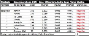 La pasta Barilla e la pasta Voiello, che sono due paste dello stesso gruppo, presentano, rispettivamente, per ciò che riguarda la micotossina DON 161 ppb (parti per biliardo) e 180 ppb. Per ciò che riguarda il Glifosate – sempre con riferimento alla Barilla e alla Voiello – presentano, rispettivamente, 0,102 milligrammi per chilogrammo e 0,050 milligrammi per chilogrammo. Per ciò che riguarda il Cadmio – ancora con riferimento alla Barilla e alla Voiello – presentano 0,032 milligrammi di Cadmio per chilogrammo e 0,036 sempre di questo metallo pesante. Il piombo, per fortuna, non è presente. Questo significa che Barilla e Voiello utilizzano grani duri esteri, anche se Voiello dichiara di utilizzare solo grani italiani (varietà Aureo e Svevo).