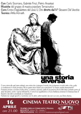 Martedì 16 aprile alle 21.00 andrà in scena al Teatro Nuovo di Pisa “Una storia diversa”,  liberamente ispirato a “La Buona Novella” di Fabrizio De Andrè, a sua volta tratto dalla lettura di alcuni Vangeli apocrifi, che racconta  le vicende di Gesù Cristo da un punto di vista insolito mai banale. Lo spettacolo è scritto diretto e interpretato da Carlo Scorrano; in scena insieme a lui  Gabriele Finzi e Pietro Anastasi, mentre le musiche saranno a cura del gruppo musicale TerraccutizZ e del coro Enrico Pappalettere del liceo Ulisse Dini di Pisa, diretto dal maestro Giuseppe Del Vecchio.