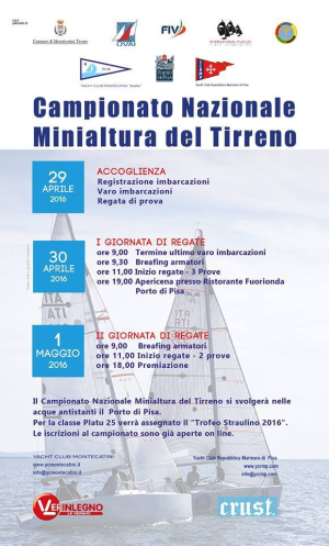 Anche a Marina di Pisa, grazie all’organizzazione dello Yacht Club Montecatini “Straulino” e dello Yacht Club Repubblica Marinara di Pisa, si svolgerà il Campionato Nazionale Minialtura del Tirreno 2016 ospitato nel Porto di Pisa. Le imbarcazioni della Classe Sportboat Orc devono rispettare alcune caratteristiche: lunghezza tra 6 e 9 metri, peso inferiore a 2000 kg e essere in regola con le certificazioni Orc, sono imbarcazioni di facile gestione e anche per questo stanno riscuotendo un grande successo tra gli armatori.