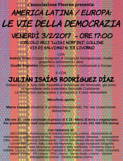 L’iniziativa di venerdì pomeriggio a Livorno annovera in qualità di relatore principale l’ambasciatore del Venezuela Julián Isaías Rodríguez Díaz, accompagnato dall’avvocato Gisella Seghettini, che tratterà la questione delle esperienze costituzionali in Europa, dall’analista esperto di questioni latinoamericane, dr Marco Consolo, e dal professor Andrea Vento, docente di geografia esperto di America Latina.