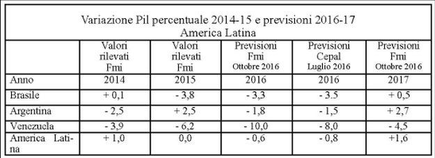 La nuova strategia statunitense è senz’altro stata favorita da alcuni limiti evidenziati nell’azione di governo da parte dei governi progressisti ma anche dall’eccessiva dipendenza dal modello estrattivista. Il calo delle quotazioni delle commodities e l’eccessiva dipendenza da queste ultime, ha condizionato il trend economico dell’intera macroregione che ha registrato un sensibile rallentamento fino a sprofondare nel 2016 in recessione (vedi Tabella 1), aspetto abbastanza infrequente per un’area in fase di sviluppo, in assenza di crisi internazionali. In particolare sta destando particolare preoccupazione il ciclo economico dell’America Meridionale che ha registrato una contrazione della ricchezza prodotta sia nel 2015 che nell’anno appena concluso, condizione difficilmente evitabile dal momento che le 3 principali economie sudamericane, Brasile, Argentina e Venezuela, vedranno il proprio Pil ridursi nel 2016 (Vedi tabella 2).