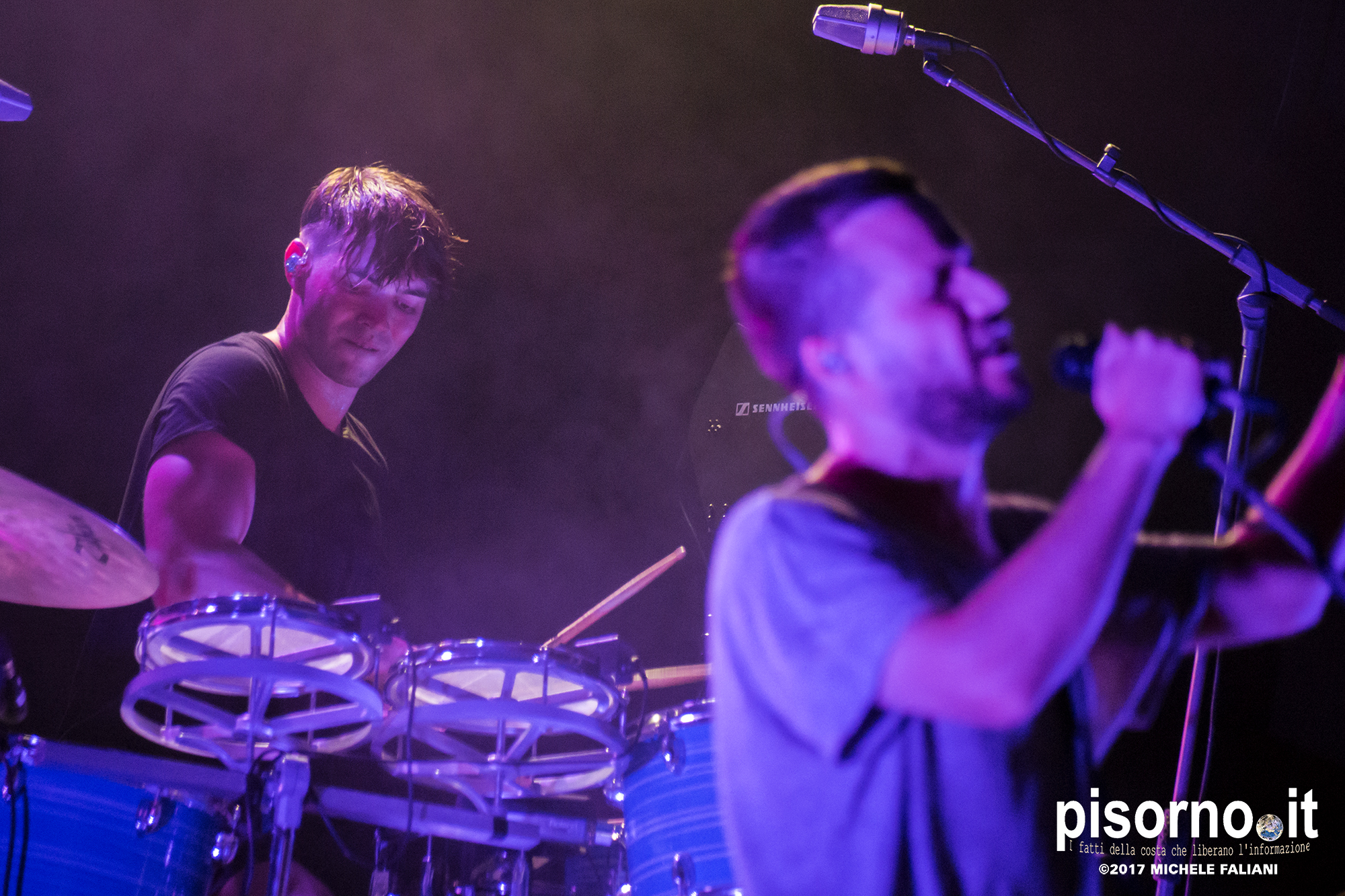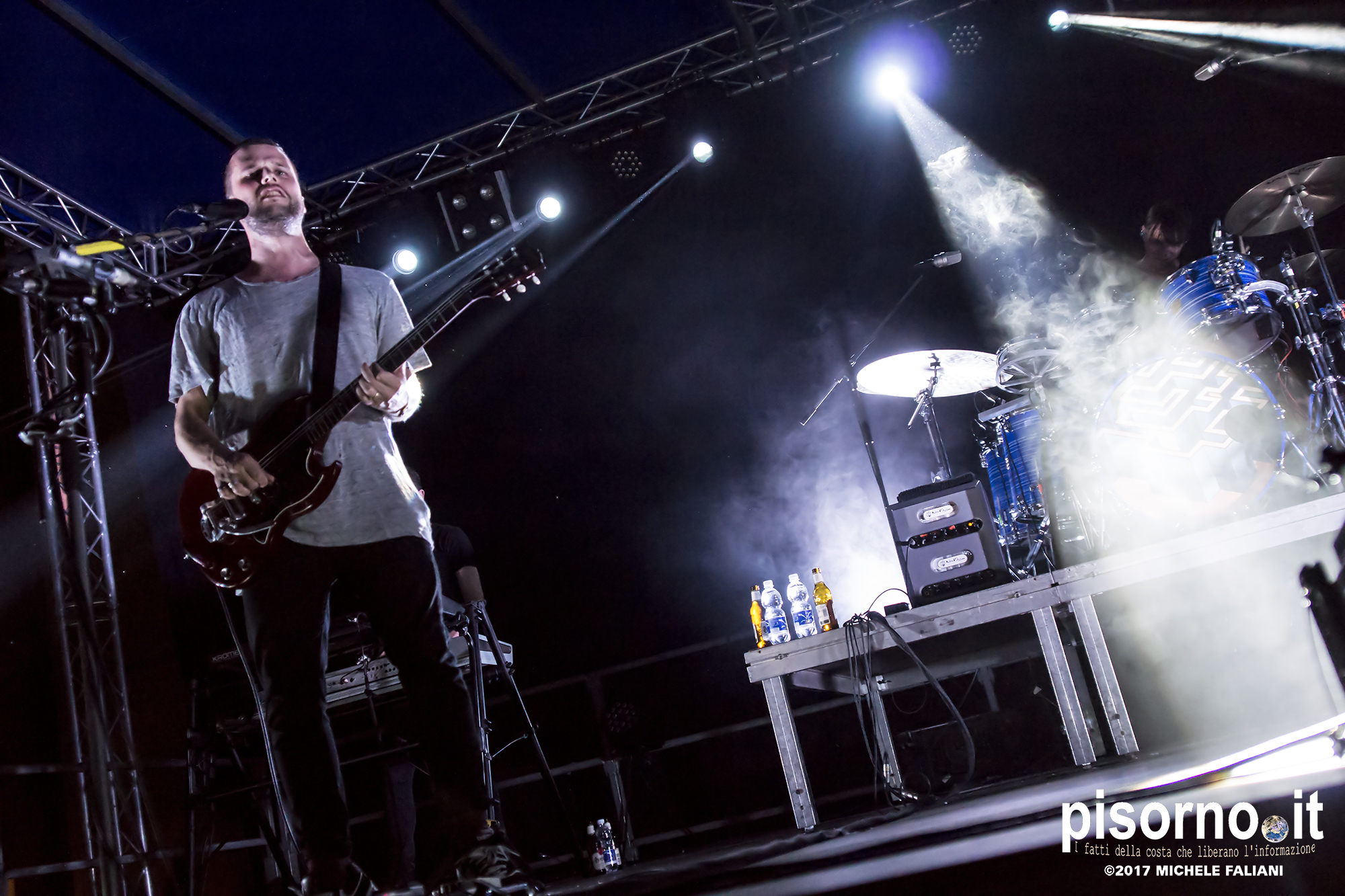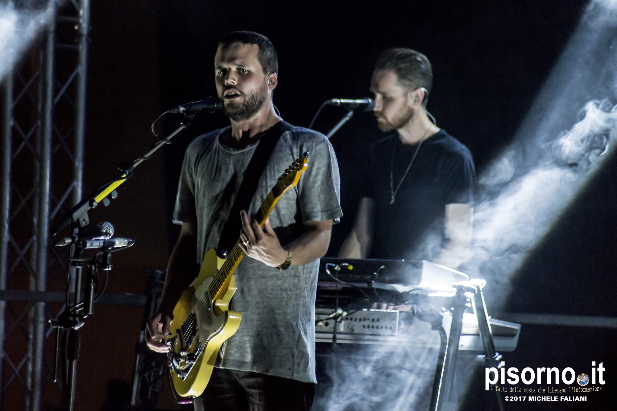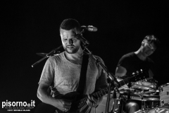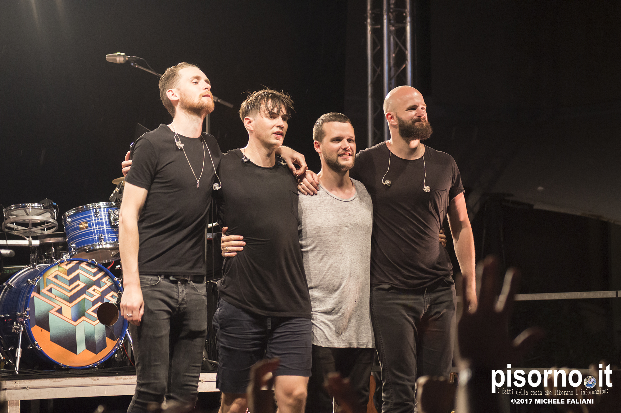 Con queste parole Harry McVeigh ha espresso il proprio disappunto per il tipico acquazzone estivo (neanche troppo violento, a dire la verità) che si è abbattuto su Sestri Levante da metà concerto in poi. Concerto, lo dico subito, nettamente superiore a quello a cui ebbi il piacere di assistere tre anni fa a Milano, nel quale i White Lies sembravano un po’ spenti e comunque troppo simili ai dischi in studio. Quello del Mojotic ha visto, è vero, McVeigh un po’ stanco di voce, ma l’ora e mezzo di spettacolo ha dimostrato che i WL sono una band che dal vivo sa tirare fuori il meglio di se, non solo nei vecchi ‘classici’ (splendide “To lose my life”, “Unfinished business” e la finale “Bigger than us”) che nei pezzi che compongono l’ultimo lavoro “Friends” (la bellissima “Swing”). E per gustarsi una band come i White Lies, cosa volete sia qualche goccia di pioggia?