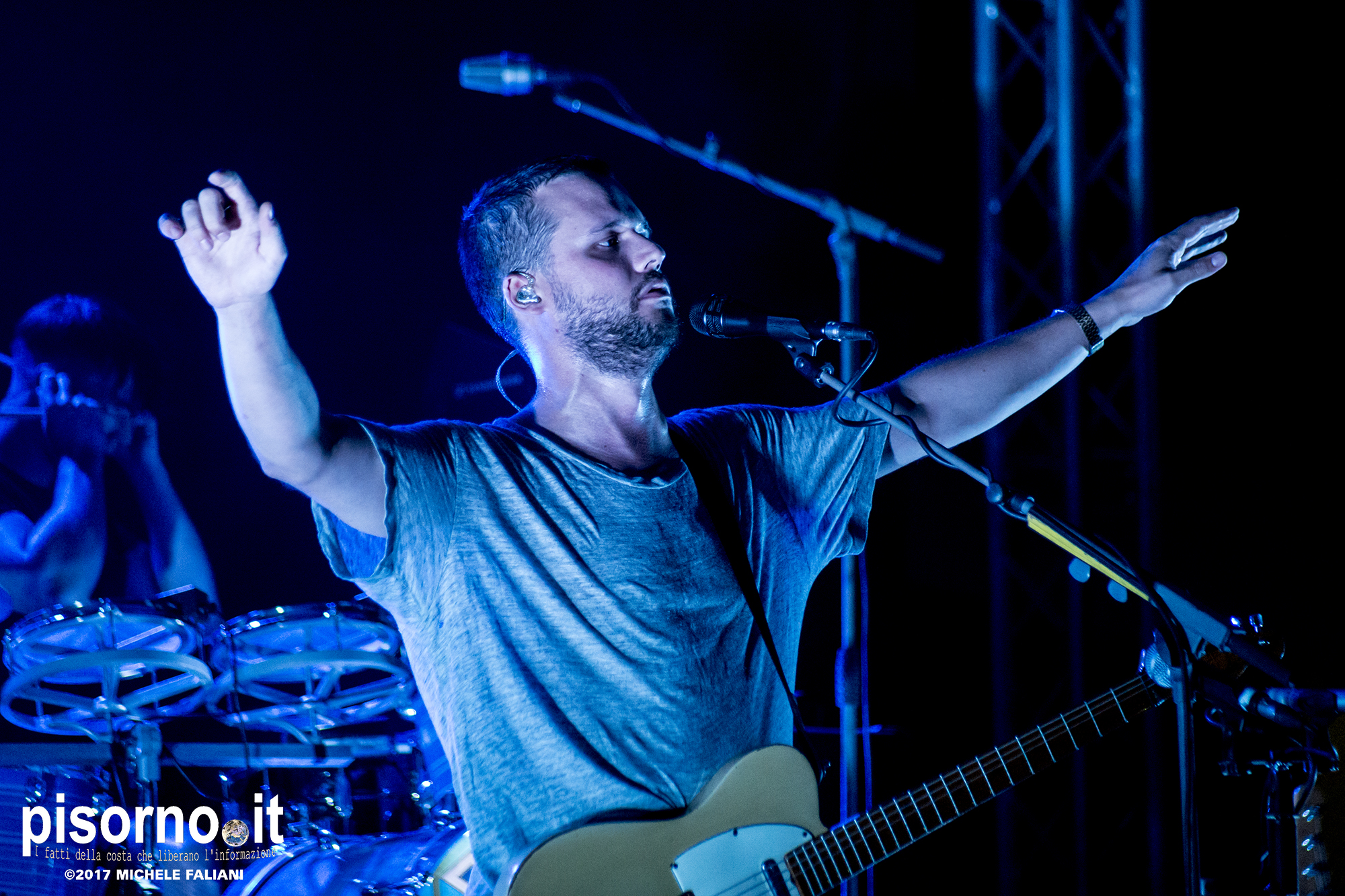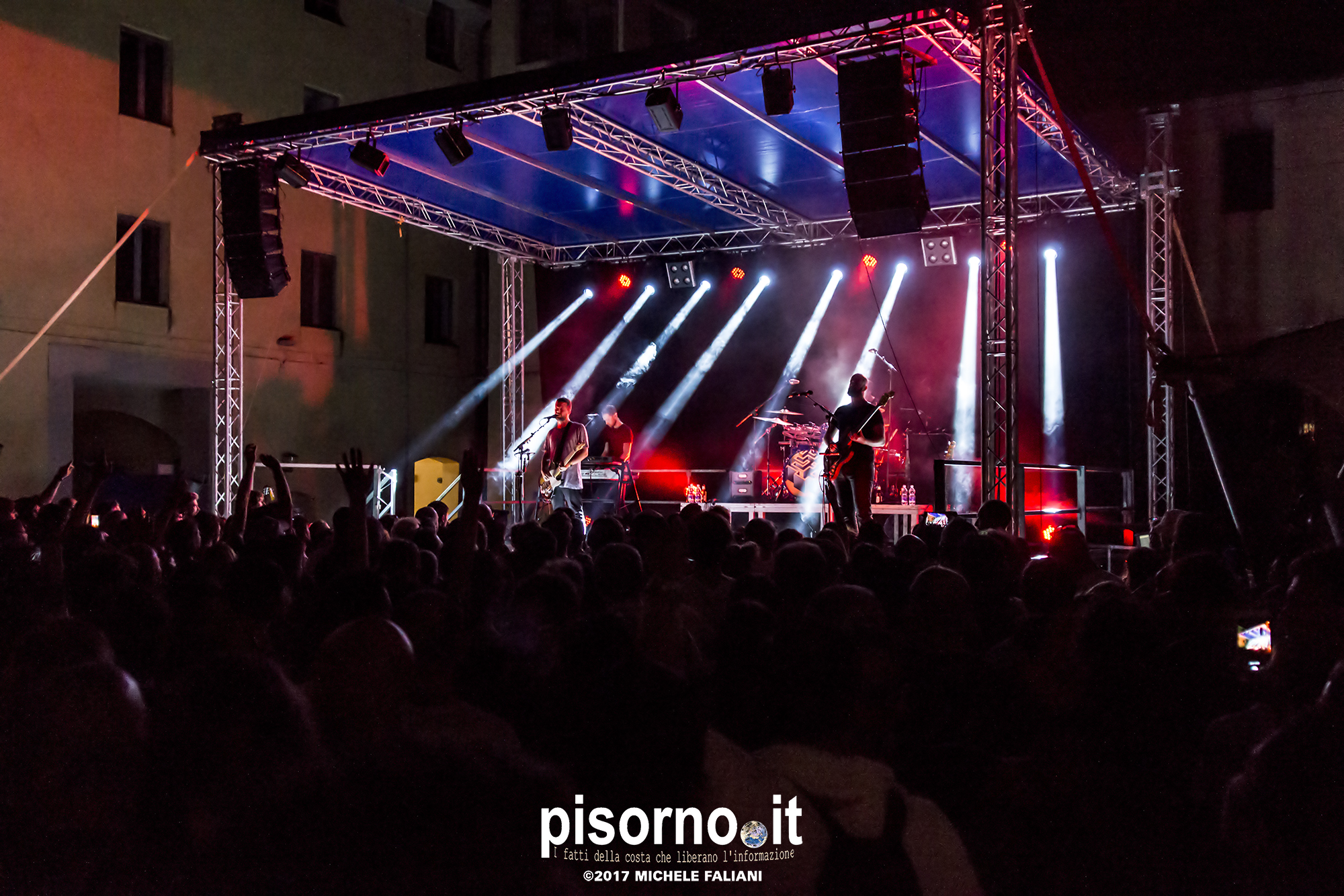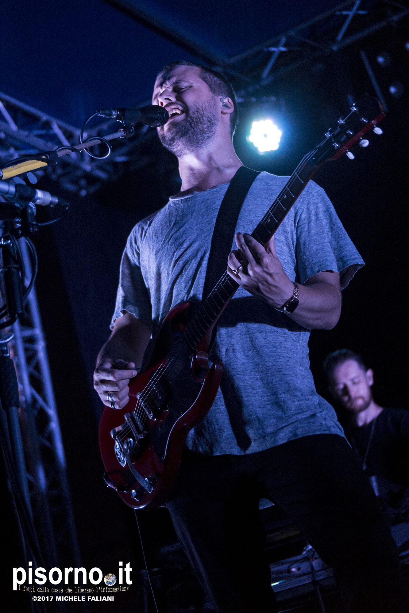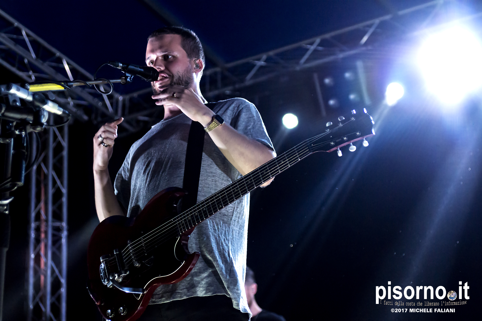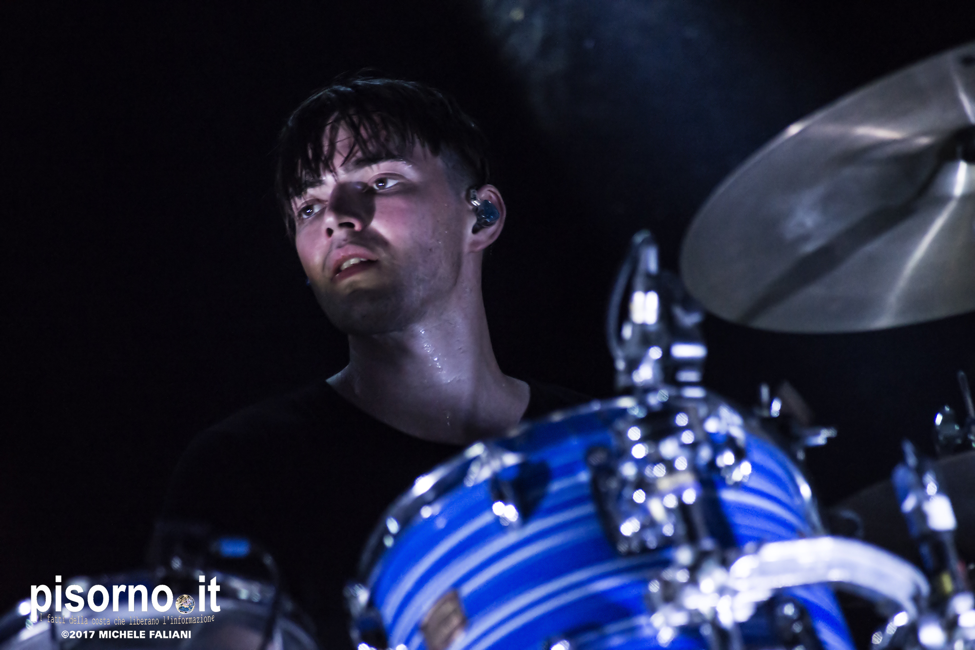 Con queste parole Harry McVeigh ha espresso il proprio disappunto per il tipico acquazzone estivo (neanche troppo violento, a dire la verità) che si è abbattuto su Sestri Levante da metà concerto in poi. Concerto, lo dico subito, nettamente superiore a quello a cui ebbi il piacere di assistere tre anni fa a Milano, nel quale i White Lies sembravano un po’ spenti e comunque troppo simili ai dischi in studio. Quello del Mojotic ha visto, è vero, McVeigh un po’ stanco di voce, ma l’ora e mezzo di spettacolo ha dimostrato che i WL sono una band che dal vivo sa tirare fuori il meglio di se, non solo nei vecchi ‘classici’ (splendide “To lose my life”, “Unfinished business” e la finale “Bigger than us”) che nei pezzi che compongono l’ultimo lavoro “Friends” (la bellissima “Swing”). E per gustarsi una band come i White Lies, cosa volete sia qualche goccia di pioggia?