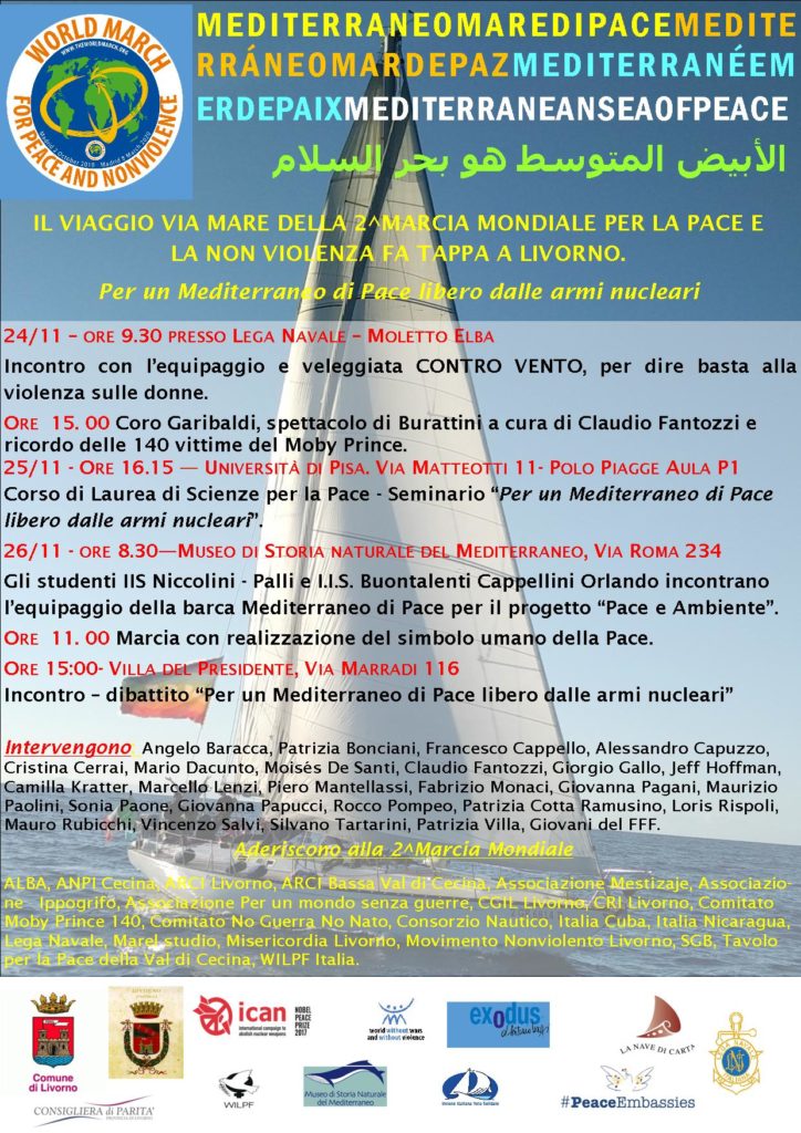 A Livorno si concluderà il percorso via mare della Marcia con l’arrivo domenica 24 novembre al Moletto Elba (presso la Lega Navale) della “Barca Bamboo Mediterraneo di Pace” che, partita da Genova, ha toccato i porti di Marsiglia, Barcellona, Cagliari, Palermo lanciando l’istanza di un Mediterraneo di Pace libero dalle armi nucleari, come affermato dalla Dichiarazione di Barcellona(1995)e ribadito anche dal Trattato di Proibizione della Armi Nucleari(adottato dall’ONU il 7 luglio 2017)