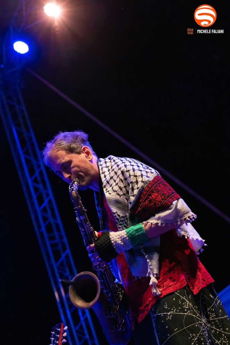 Ogni brano ha preso forma come un gesto rituale: le note si espandevano e si ritraevano, lasciando spazio al silenzio, al respiro condiviso con la platea. Alcuni momenti si accendevano di tribalismi e aperture jazz-rock, altri si raccoglievano in soliloqui fragili, quasi sussurrati. In questa alternanza, l’aspetto sacrale e quello viscerale si incontravano senza mai scontrarsi, creando una tensione magnetica.