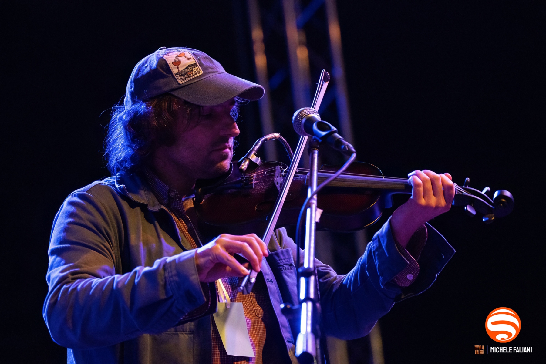 Un veloce cambio palco ed è andata sotto gli spot l’Orchestre Tout Puissant Marcel Duchamp, combo svizzero che avemmo il piacere di vedere un paio d’anni fa al Lumière di Pisa. Quando le prime note hanno iniziato a vibrare nell’aria, una luce ambrata si è sospesa tra riflettori e notte, una luce che sembrava disegnata apposta per accogliere il loro universo sonoro. Dodici musicisti affollavano un palco quasi troppo piccolo per contenerne l’energia: due chitarre, doppia batteria e percussioni, doppia marimba, tromba, trombone, contrabbasso, violoncello e violino, con quasi tutti a condividere anche le voci.