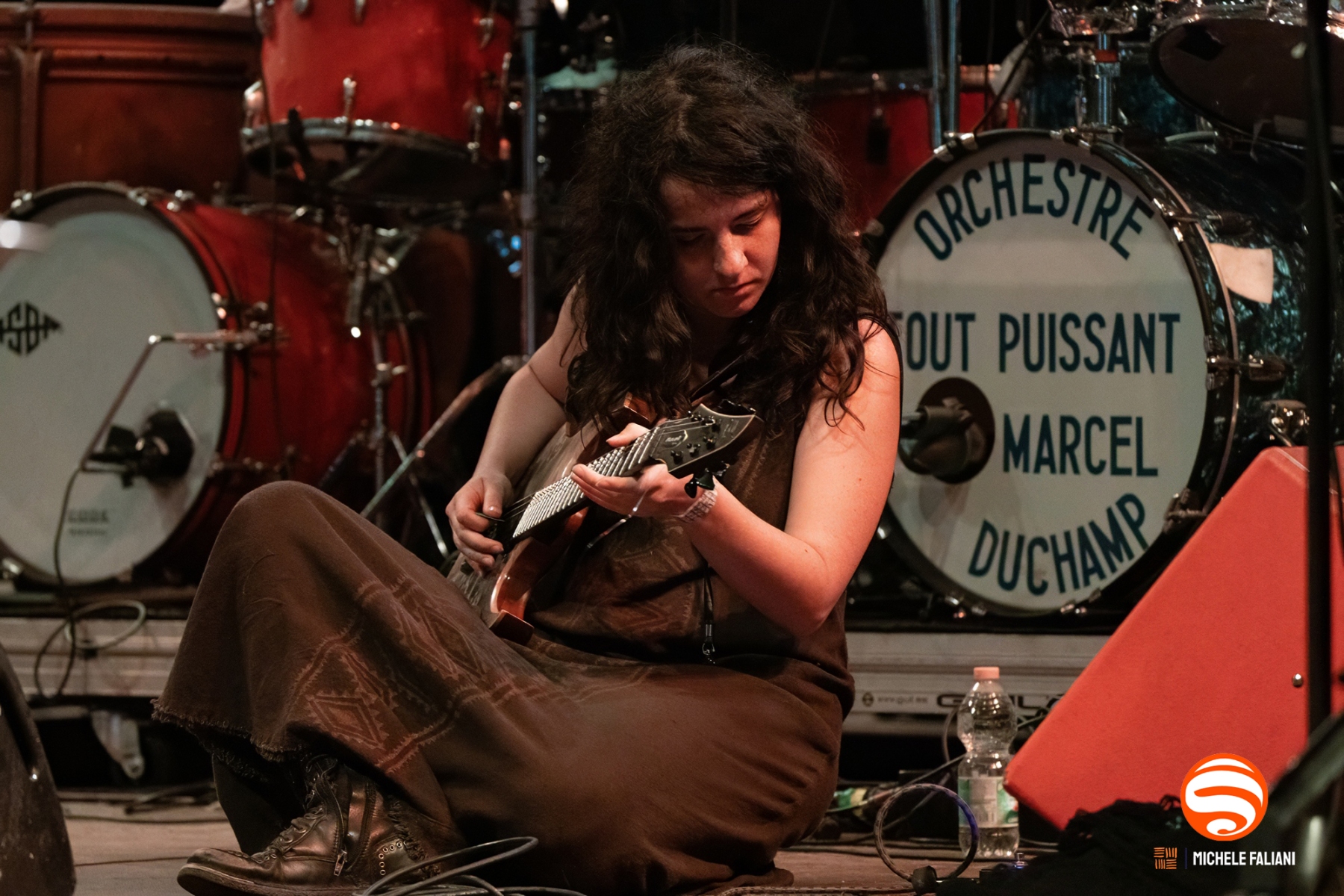 Un veloce cambio palco ed è andata sotto gli spot l’Orchestre Tout Puissant Marcel Duchamp, combo svizzero che avemmo il piacere di vedere un paio d’anni fa al Lumière di Pisa. Quando le prime note hanno iniziato a vibrare nell’aria, una luce ambrata si è sospesa tra riflettori e notte, una luce che sembrava disegnata apposta per accogliere il loro universo sonoro. Dodici musicisti affollavano un palco quasi troppo piccolo per contenerne l’energia: due chitarre, doppia batteria e percussioni, doppia marimba, tromba, trombone, contrabbasso, violoncello e violino, con quasi tutti a condividere anche le voci.