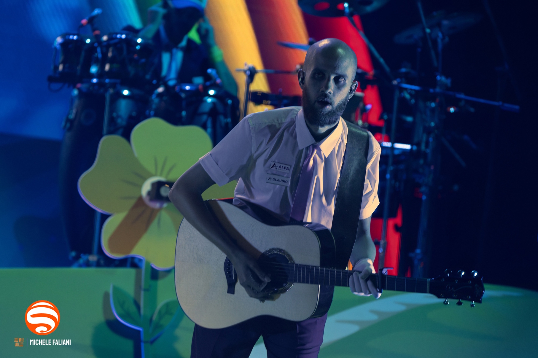 Il palco riproduce fedelmente quel mondo: un arcobaleno di colori pastello e la panchina gialla diventano gli elementi di un’atmosfera intima e vibrante, come se ogni spettatore fosse invitato ad accomodarsi dentro il suo universo. Brani come «Testa tra le nuvole, pt. 2», «Wanderlust!», «Tante mila volte» e «Testa tra le nuvole, pt. 1» scorrono come capitoli di un diario aperto, e il pubblico li canta a squarciagola, celebrando la scelta dell’allegria e della leggerezza.