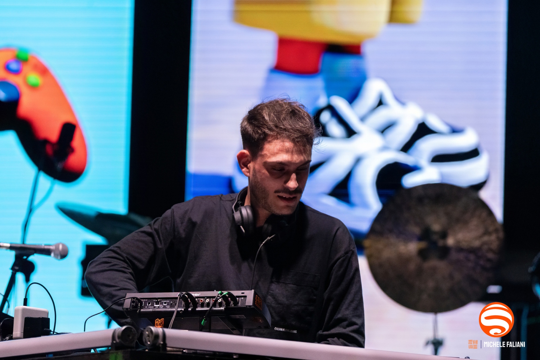 Al centro, una grande console: da un lato ASCO governa le macchine, dall’altro si cala nei panni di direttore d’orchestra. Con bacchetta e cuffie guida il caos dei suoni, armonizzandoli con la sua elettronica. È il manifesto della sua idea: la musica come unione, come linguaggio che non esclude ma include.
