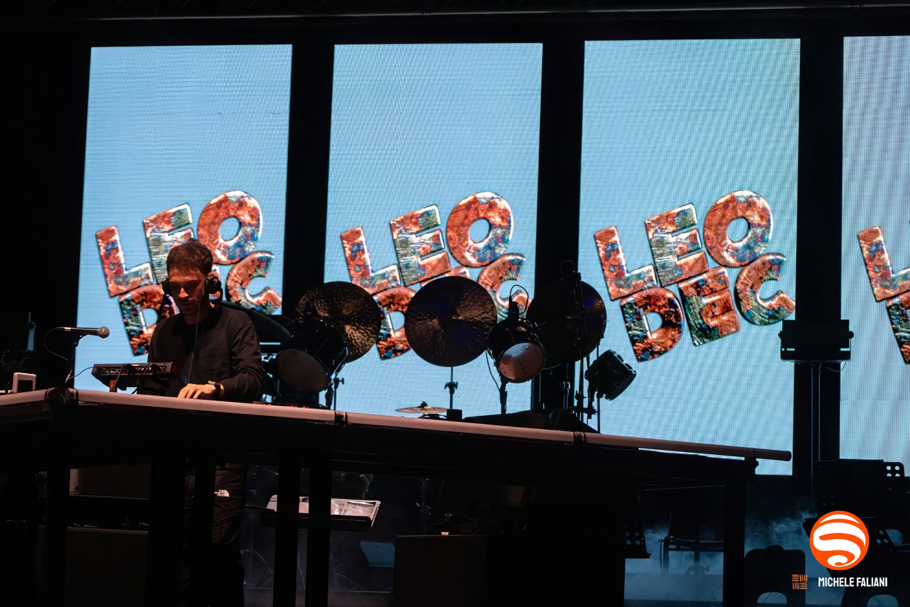Al centro, una grande console: da un lato ASCO governa le macchine, dall’altro si cala nei panni di direttore d’orchestra. Con bacchetta e cuffie guida il caos dei suoni, armonizzandoli con la sua elettronica. È il manifesto della sua idea: la musica come unione, come linguaggio che non esclude ma include.
