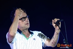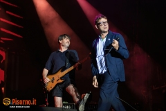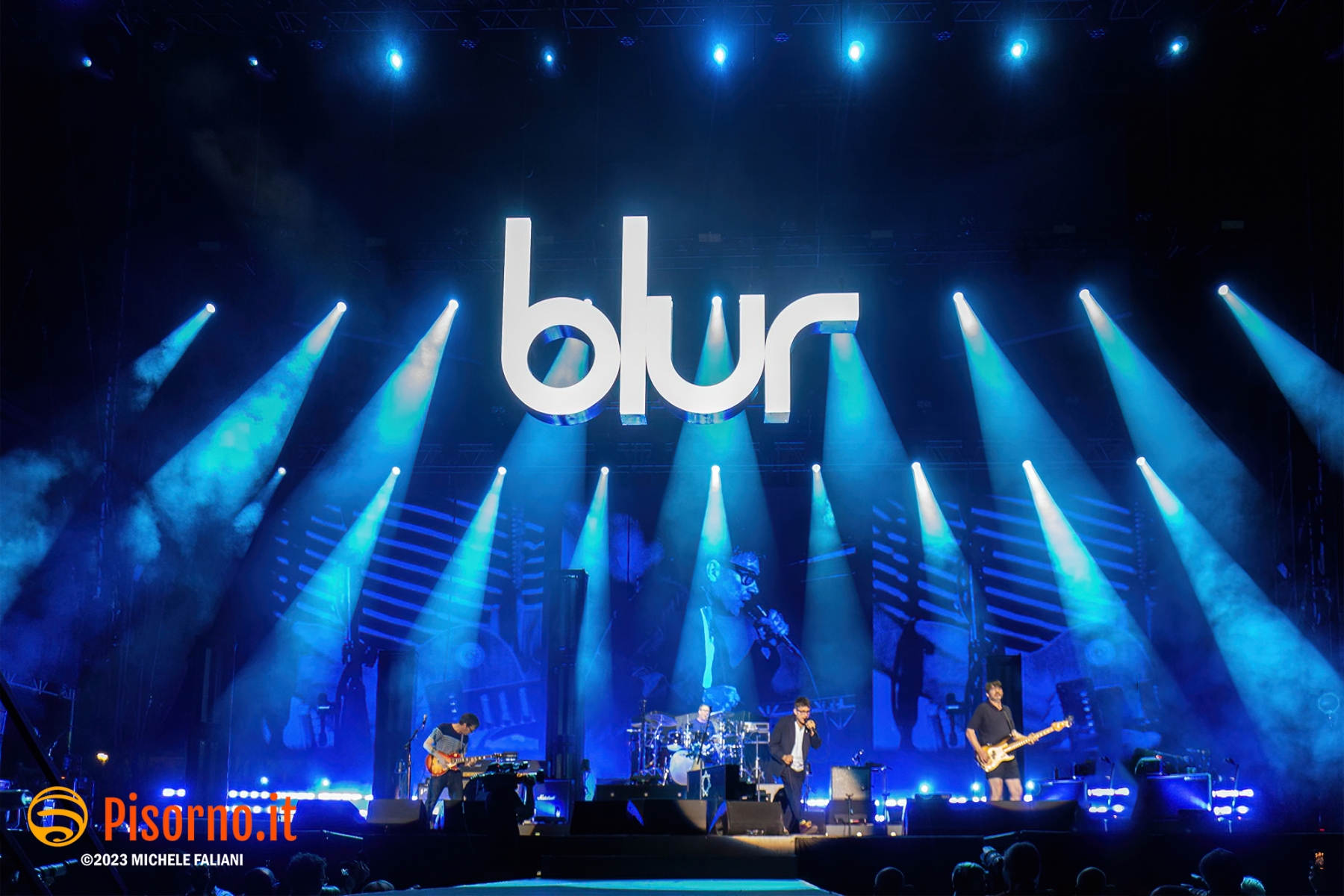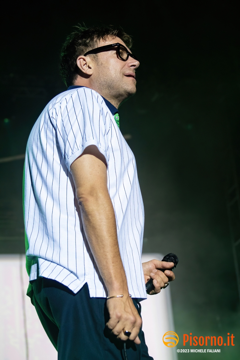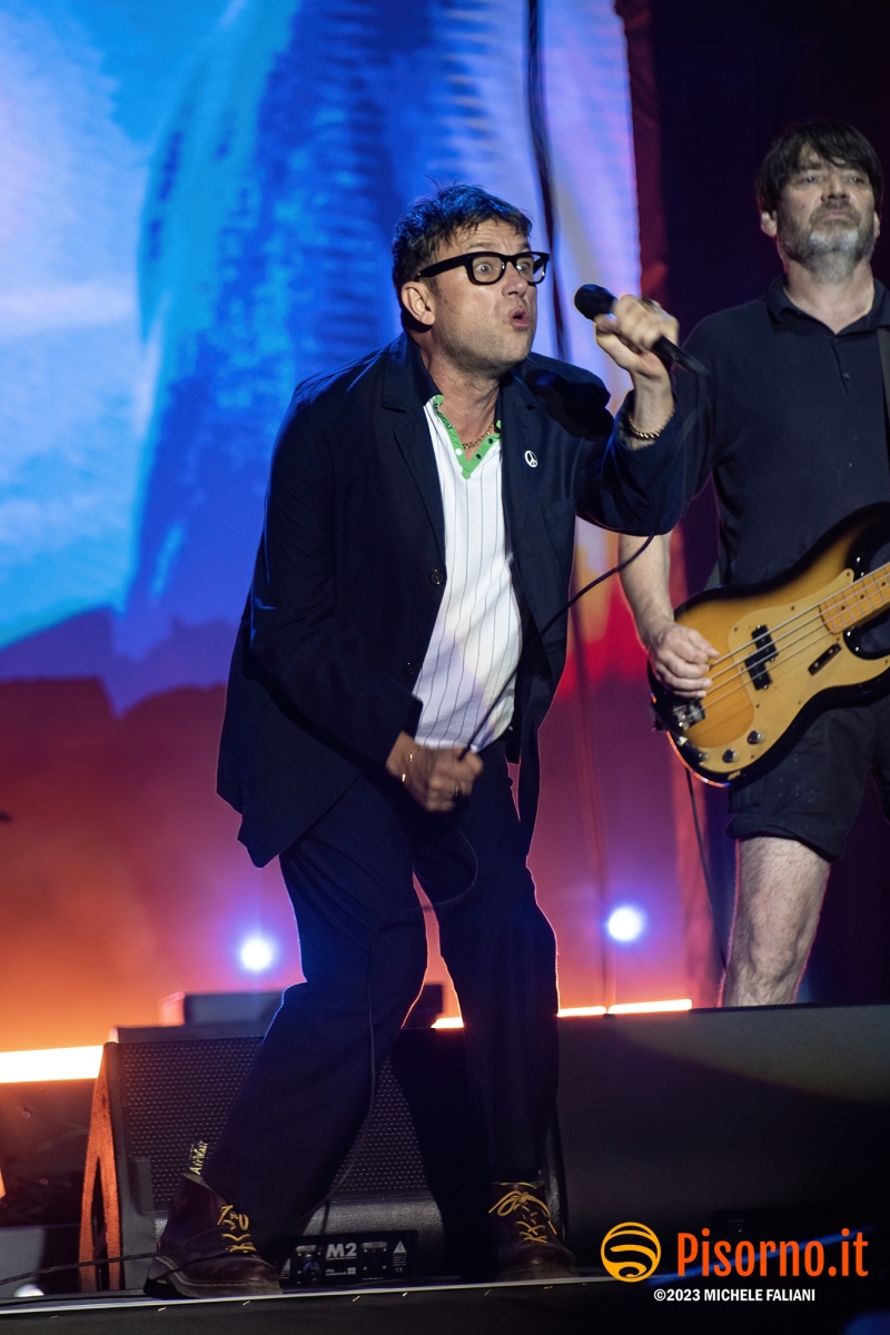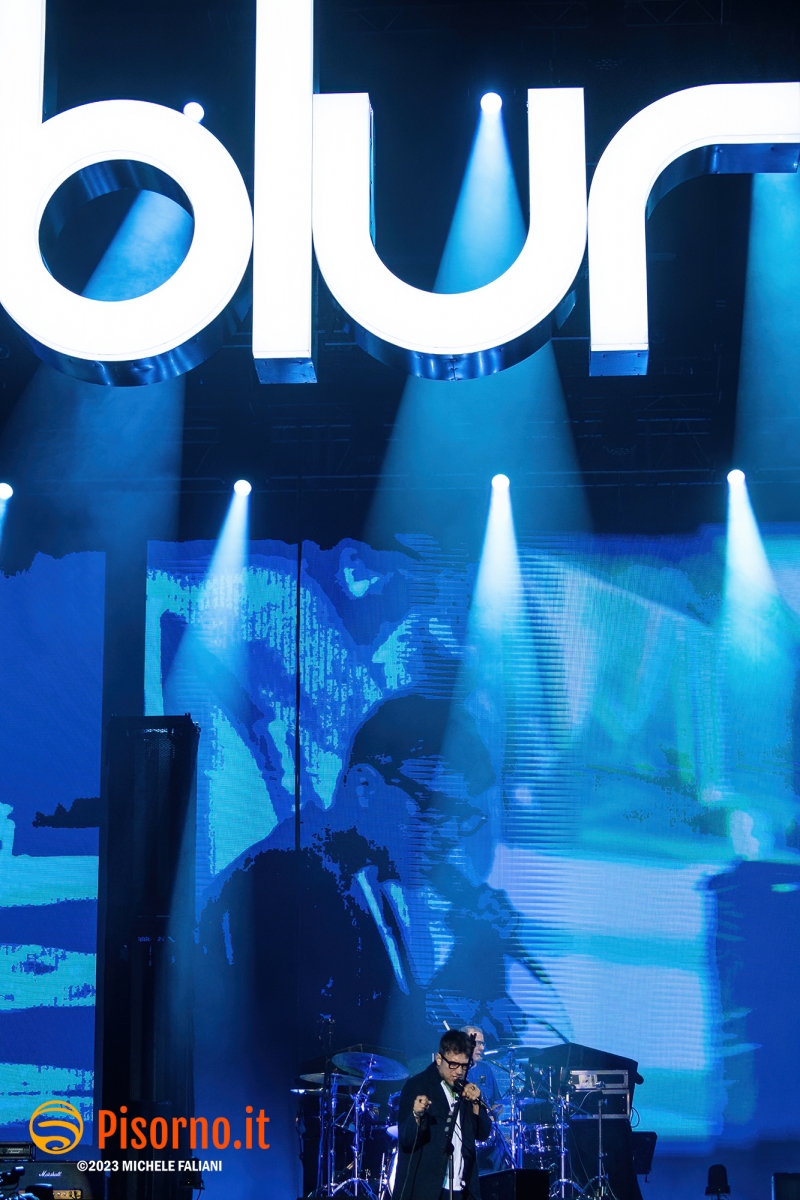 Riecco Damon Albarn e soci, 10 anni dopo l’ultima volta in Italia, 24 ore dopo aver rilasciato sul mercato il loro 9° album in studio, suonare davanti a oltre 45000 persone per 90 minuti precisi una setlist di 23 canzoni, bis compresi. I freddi numeri della serata sono questi, ma fortunatamente nella serata perfetta dei Blur c’è tanto di più: sotto le mura storiche di Lucca (organizzata alla perfezione per ricevere la marea di appassionati che hanno riempito il prato vicino alla porta San Pietro), su un palco enorme e con una scenografia imponente, si sono presentati al pubblico sulle note di “The debt collector”, dimostrandosi subito carichi, sorridenti e vogliosi di divertirsi e far divertire. Alex James, il bassista, suona con la sigaretta in bocca e con la stessa tranquillità con cui (crediamo) produca il formaggio nella sua fattoria, Damon Albarn riesce a tenersi la giacca solo per il primo pezzo, poi se la toglie e inizia a saltare come un pazzo su e giù lungo la passarella che si infila fra i fans in delirio. Graham Coxon pennella riff con la sua Les Paul, e Dave Rowntree picchia sui tamburi con precisione. E poi ci sono le (tante) belle canzoni che i Blur ci hanno regalato in questi anni, da Song 2, che ha accompagnato a lungo i malati di Fifa 98, a Coffee & TV, che ci fece innamorare del cartone del latte protagonista del videoclip di tanti anni fa; c’è il ritmo esaltante di Country house, c’è la magia di Tender con tutto il pubblico a cantare “Oh my baby, Oh my baby” e c’è pure il nostro pezzo preferito di “The ballad of Darren” (ma quanto sarà bella The narcissist?) e perfino qualche perla nascosta come Tracy Jacks e Villa Rosie, che esaltano soprattutto chi conosce bene i Blur e chi li segue dall’inizio. Insomma, il tempo sembra non essersi mai fermato per Albarn e soci, rimangono i soliti ragazzi dall’aria strafottente che sono sempre stati ma con in più una maturità artistica invidiabile. Speriamo di non dover aspettare altri 10 anni prima di rivederli da queste parti.