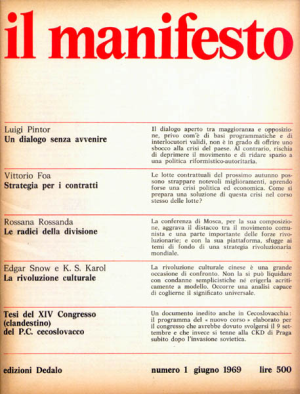 Dopo il 68, in Italia, scoppia un diffuso e difficile confronto-scontro politico a sinistra, con scomposizioni e ricomposizioni delle diverse organizzazioni e soggetti in campo nel conflitto sociale, cresce vistosamente un dibattito fortemente critico fuori e, per la prima volta, anche dentro il Partito Comunista. In questo clima, nasce la rivista politica, a tiratura mensile, “il manifesto”, da ricordare che il primo numero, Edizioni Dedalo, uscito il 23 giugno 1969 al costo di 500 lire, vendette in pochi giorni ben 30mila copie. Alla redazione diretta da Lucio Magri e Rossana Rossanda, parteciparono: Luigi Pintor, Aldo Natoli, Valentino Parlato, Luciana Castellina, Lidia Menapace e Ninetta Zandegiacomi.