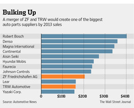 La tedesca ZF Friedrichshafen sta cercando di prendere il controllo della rivale americana TRW Automotive Holdings (-0,97%) con una mossa da oltre 10 miliardi di dollari. Se andasse in porto, sarebbe la più grande operazione del comparto da anni e unirebbe due aziende con ricavi combinati da 37 miliardi di dollari. La societa’ che emergerebbe dalla fusione sarebbe grande tanto quanto i leader di mercato, la tedesca Robert Bosch GmbH o la giapponese Denso.