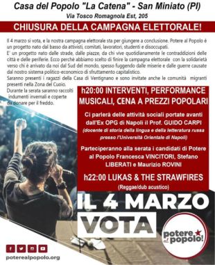 Orgogliosi di un percorso che ha visto migliaia di militanti mettersi in gioco in questi due mesi per la ricostruzione di una forza giovane e propositiva, di sinistra ed antifascista come ‘Potere al Popolo’ invitiamo tutta la cittadinanza a festeggiare con noi e rispondere a queste bieche provocazioni, oltre che dare solidarietà al circolo e all’Arci Zona Cuoio. Potere al Popolo è un progetto nato dal basso da attivisti, comitati, lavoratori, studenti e disoccupati. E’ un progetto nato dalle strade, dalle piazze, da chi vive quotidianamente le contraddizioni delle città e delle periferie. Ecco perchè abbiamo scelto di finire la campagna elettorale con la solidarietà verso chi è arrivato da noi dal Sud del mondo, spesso fuggendo dalle miserie e dalle guerre causate dal nostro sistema politico-economico occidentale. Saranno presenti i ragazzi della Casa di Ventignano e sono invitate anche le comunità migranti presenti nella Zona del Cuoio. Raccolta indumenti invernali e coperte da donare ai ragazzi e a chiunque abbia bisogno.”
