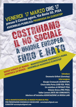 Venerdì 17 marzo ore 17 – presso il Circolo agorà, Via Bovio 50 Pisa, promossa da Eurostop si terrà l’assemblea pubblica su: “costruiamo il No Sociale a Ue, Nato, Euro. Verso la manifestazione nazionale del 25 marzo”. Intervengono:
