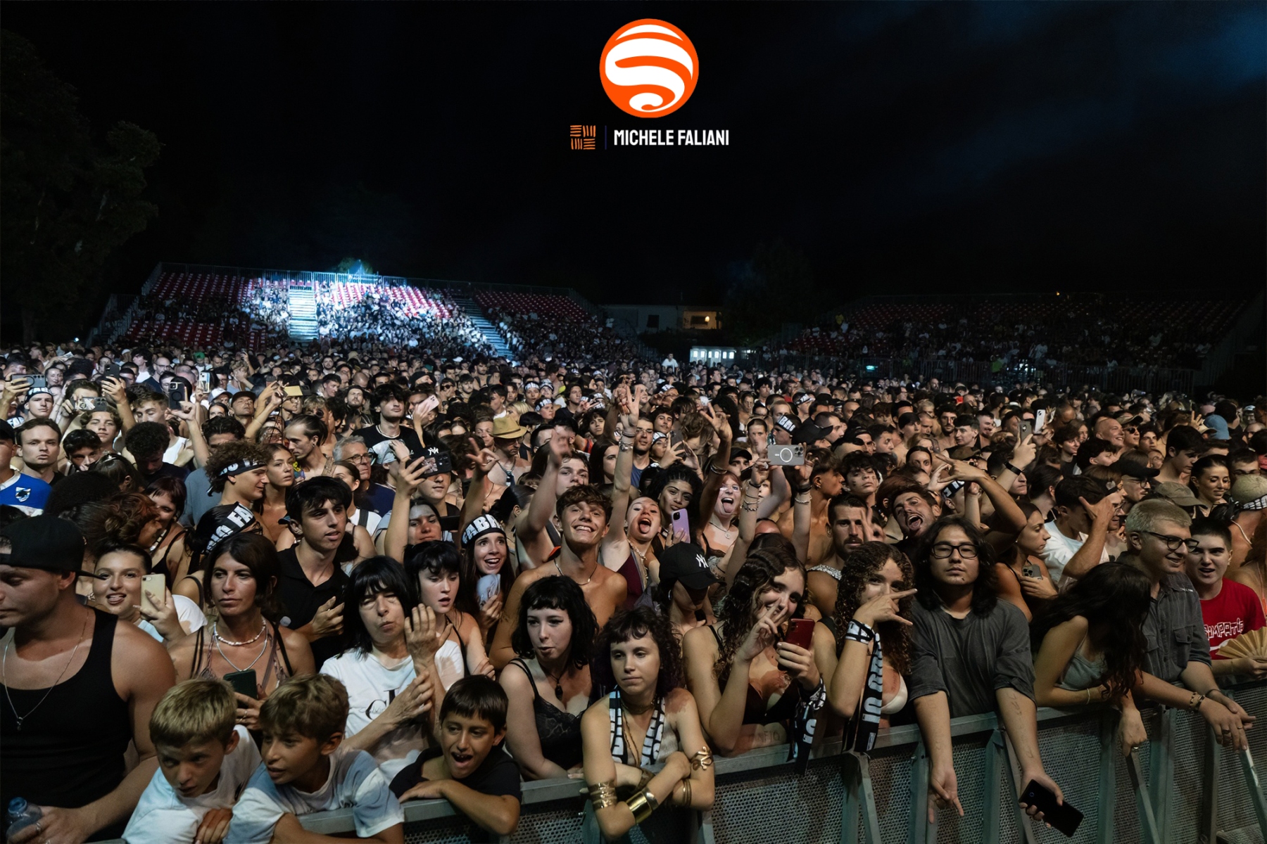 «Qui a Forte dei Marmi c’è un botto di gente, probabilmente il miglior pubblico che abbia mai visto», dice, voltandosi verso Double S, storico DJ e compagno di palco, piazzato su un’enorme audiocassetta bianca. Poi, con la sua ironia corrosiva, lancia la battuta: «Ma i reggiseni che tirate sul palco ve li sfilate o li portate da casa e li infilate nella borsa?», prima di divertire tutti annusando uno dei reggiseni lanciati dalle fan. Ma poi le parole prendono il sopravvento, pesano come macigni e non sono mai banali.