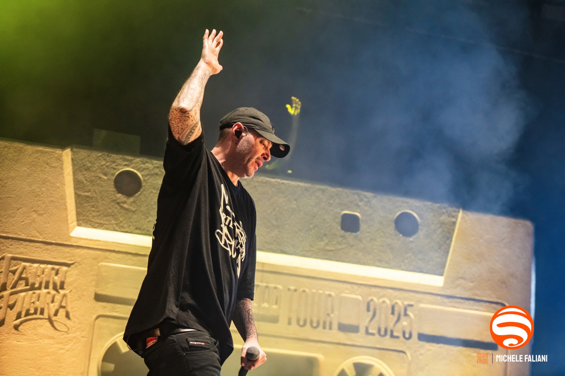 Fibra è a casa sua. Nessuna scenografia (oltre alla cassetta): cappellino nero, microfono e maglietta con scritto Forte dei Marmi incastonato nella grafica del nuovo disco. Gli basta e avanza. Parla con il pubblico, scherza, si diverte, poi scarica raffiche di rime: novanta minuti senza tregua.