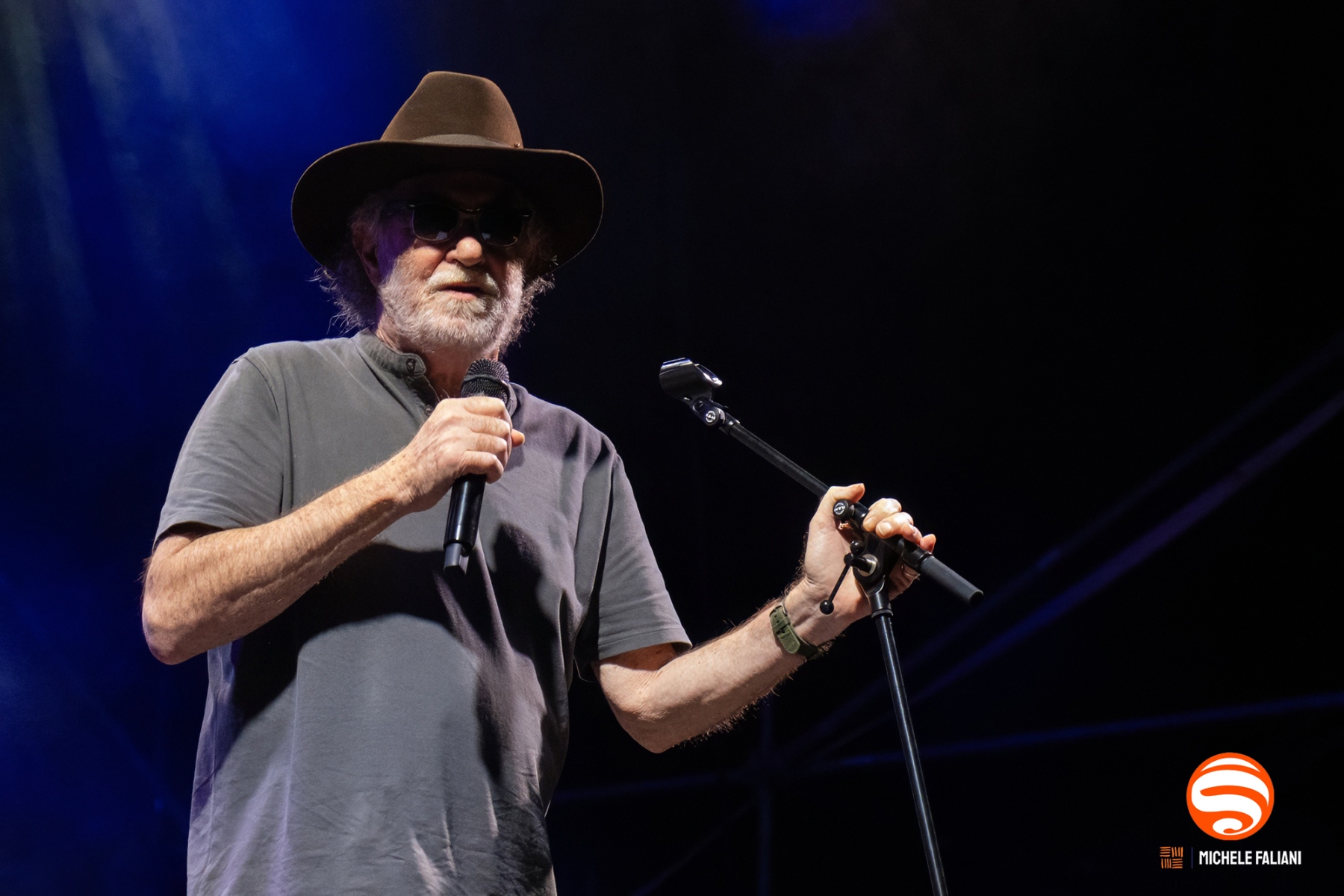 L’acquazzone che ho preso mentre giravo in scooter per il centro di Livorno in mattinata, e quello più breve che tanto per non farmi mancare niente, mi sono beccato nel centro di Empoli nelle prime ore del pomeriggio, mi preoccupavano non poco. Stava per cominciare di lì a poco la nuova edizione di Summer Knights, il bel festival che Live Emotion Group organizza in collaborazione con il Comune di Pisa in Piazza dei Cavalieri, oltretutto con il mio cantautore preferito. E perdermi un concerto di Francesco De Gregori per il maltempo mi avrebbe fatto incavolare non poco. Siamo stati fortunati, il tempo ha retto e Ciccio e la sua band sono saliti sul palco alle 21,15 precise, per iniziare uno dei primi concerti di questo tour che festeggia il cinquantesimo compleanno di Rimmel. Il via è stato dato con Mannaggia alla musica, una outtake di Viva l’Italia che prima di essere inserita in versione voce e chitarra nel live Bootleg del ’95, era una delle canzoni che componevano Una città per cantare, album del 1980 di Ron. Arrangiamento bellissimo per questa piccola gemma che non conoscono in molti, alla quale hanno fatto seguito due classici (Cercando un altro Egitto e Caterina, con il suono dell’Hammond di Primiano Di Biase in bella evidenza) e un’altra chicca, Caldo e scuro. Quando arriva il momento di iniziare con le canzoni di Rimmel, De Gregori dice che “questo concerto non è una celebrazione, ma il festeggiamento dei cinquant’anni di un disco che amate e che anch’io amo molto”. La promessa è quella di eseguire le canzoni con arrangiamenti molto simili a quelli del disco del 1975, promessa che non viene mantenuta con Pezzi di vetro che diventa, come nel disco Pastiche con Checco Zalone, una perla voce e pianoforte ancora più emozionante della versione originale. Rimmel non viene eseguito seguendo la stessa scaletta del disco, ma comunque non mancano Le storie di ieri (con la lunga e bellissima introduzione al contrabbasso eseguita dal capobanda Guido Guglielminetti) e Piccola mela, che nei miei 98 precedenti concerti di De Gregori non avevo mai ascoltato. Splendida anche Pablo, che è stata assente ingiustificata dalle setlist dei concerti per troppo tempo. Terminata l’esecuzione del disco (con Buonanotte fiorellino opportunamente lasciata da parte per l’immancabile bis) si ritorna a spaziare nello sterminato songbook del Principe, alternando canzoni che non possono mancare (La donna cannone, Sempre e per sempre) a qualche ripescaggio inaspettato (Adelante! Adelante!, sempre trascinante ed esaltante come tutto l’album da cui è tratta) che hanno reso il concerto una sorta di via di mezzo fra un Greatest Hits e il Nevergreen che ci siamo gustati a Milano lo scorso novembre. Poi gran finale con le due versioni di Buonanotte fiorellino, quella “classica” (con il pubblico invitato a ballare il valzer sottopalco) e quella 12&35 in stile Rainy Day Woman di Bob Dylan, con tanto di sezione fiati a spuntare sul palco. Dopo solo applausi, per un De Gregori in stato di grazia che canta sempre meglio, una band che ormai è molto di più di un semplice gruppo di strumentisti che accompagnano un cantautore, e per un album che ha compiuto mezzo secolo. Oltre 2500 persone sfollano felici dopo 100 minuti di note e parole meravigliose. Rendetevi conto cosa il maltempo stava per rovinare.