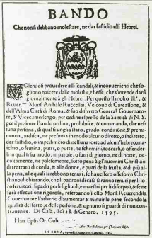 Tra l’altro si stabiliva la concessione in vendita a ciascun marinaio abitante in Livorno con moglie e figli, di una casa pagandone una parte del costo a rate, e agli Ebrei tutta una serie di privilegi e concessioni che ne garantivano l’incolumità, confermati ed estesi nel bando del 1593. (Il Vivoli in una nota degli Annali suppone anche che il bando del 1591 non sia stato pubblicato che nella versione definitiva del 1593, visto che il medesimo testo del ’91 si trovava nella collezione degli Ordini Municipali di Livorno stampata nel 1797, riportando la data del 10 giugno 1593 con dichiarazione originale di autenticità del notaio.)