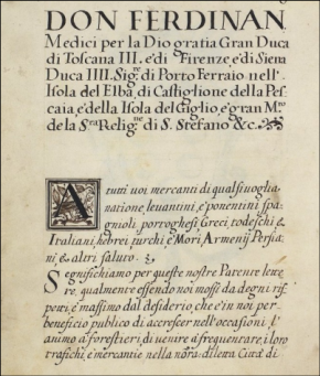 - Documento che invita i mercanti Ebrei a stabilirsi in Livorno e Pisa (Costituzione Livornina)