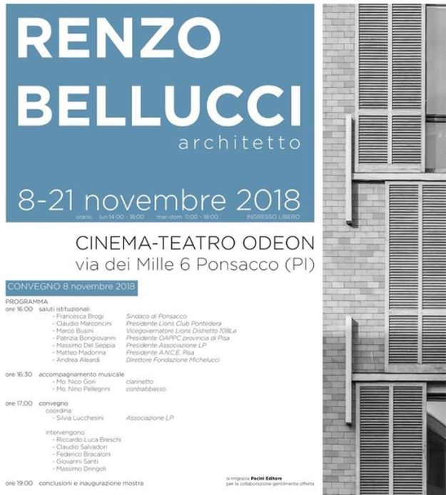 - In programma per la giornata inaugurale di giovedì 8 novembre un convegno sull’opera dell’architetto, coordinato da Silvia Lucchesini e con i contributi di Federico Bracaloni, Riccardo Luca Breschi, Massimo Dringoli, Claudio Salvadori, Giovanni Santi. La conversazione d’architettura, prevista alle ore 17, sarà introdotta dai saluti del sindaco di Ponsacco Francesca Brogi, dai rappresentanti del Lions Club Claudio Marconcini e Marco Busini, del presidente dell’Ordine degli architetti della provincia di Pisa Patrizia Bongiovanni. Interverranno inoltre Massimo Del Seppia, presidente dell’associazione LP, Matteo Madonna, presidente dell’A.N.C.E. Pisa e Andrea Aleardi, direttore della Fondazione Michelucci. Seguirà alle ore 19 l’inaugurazione della mostra.
