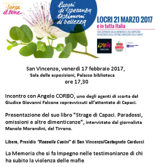 A Cecina e San Vincenzo incontri promossi da Libera con *Angelo Corbo, uno degli agenti di scorta del giudice Falcone e sopravvissuto alla strage mafiosa di Capaci, il 23 maggio 1992. Gli incontri si terranno venerdì 17 febbraio