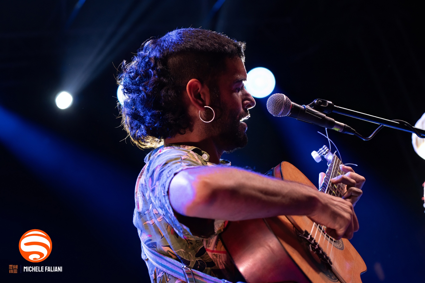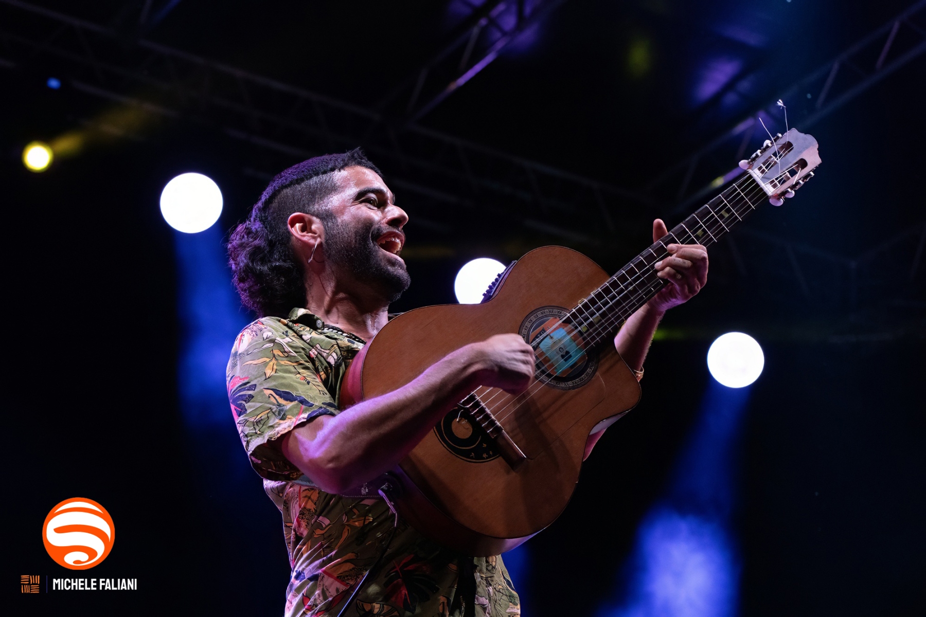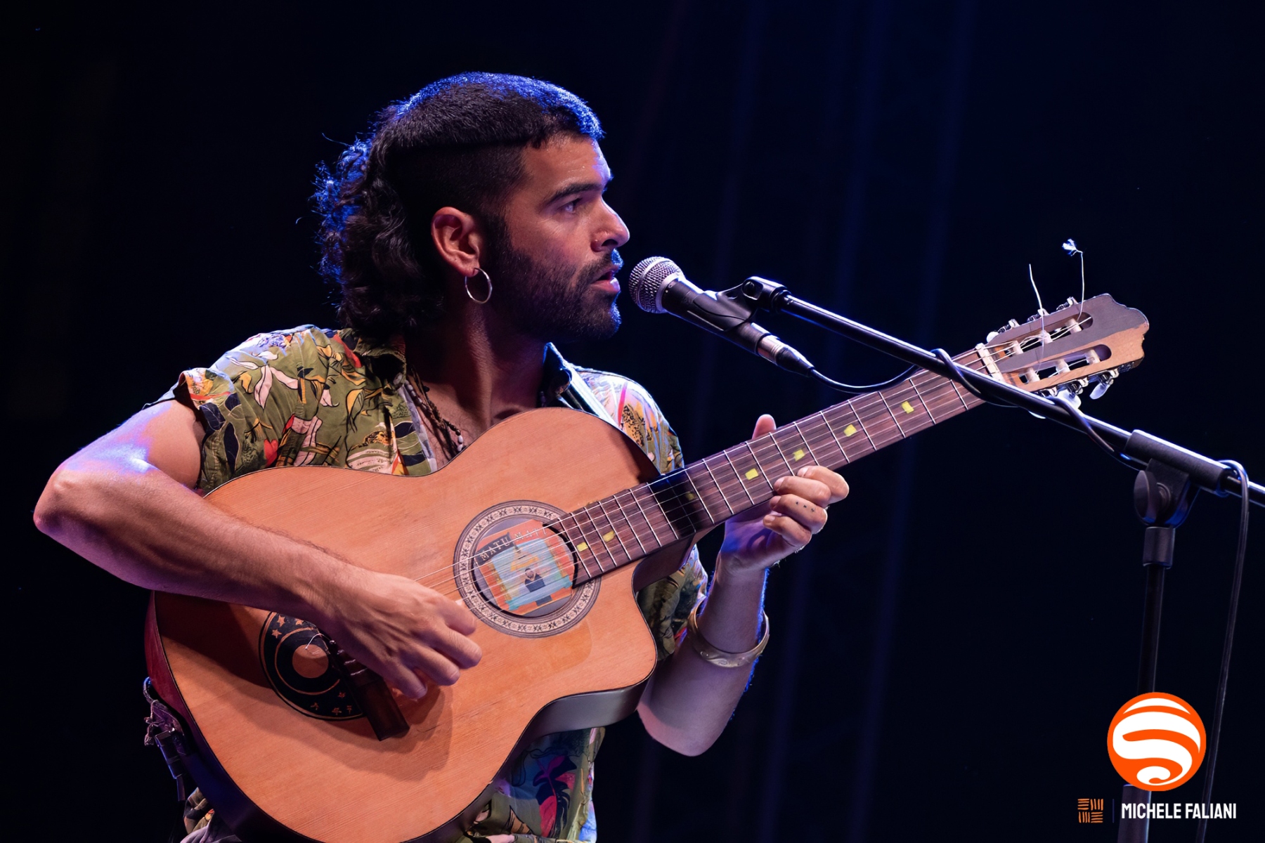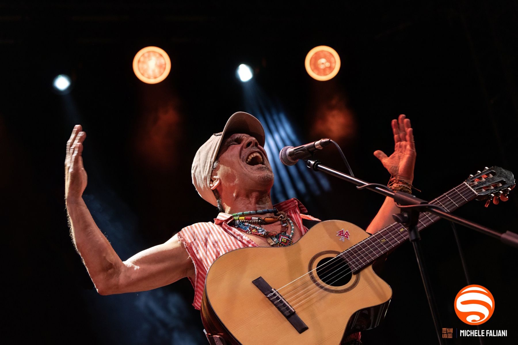 All’inizio il cantautore franco–ispanico parte morbido, quasi a voler prendere le misure al pubblico. Ma bastano pochi minuti perché la miccia si accenda: un crescendo di ritmi meticci, dalla rumba al reggae, dalla cumbia al rock, fino a far esplodere la folla in canti e danze sfrenate. Sul palco, solo lui, il percussionista e il chitarrista acustico: formazione essenziale, energia infinita.