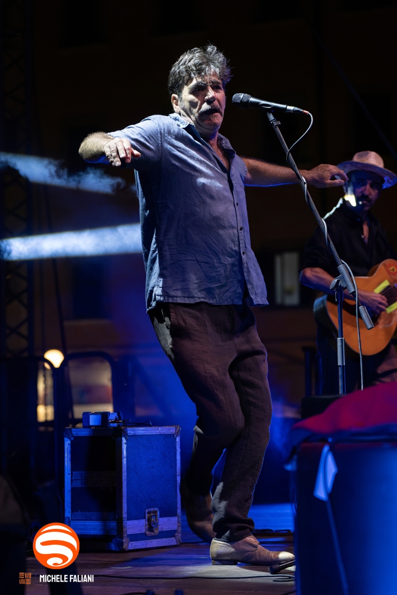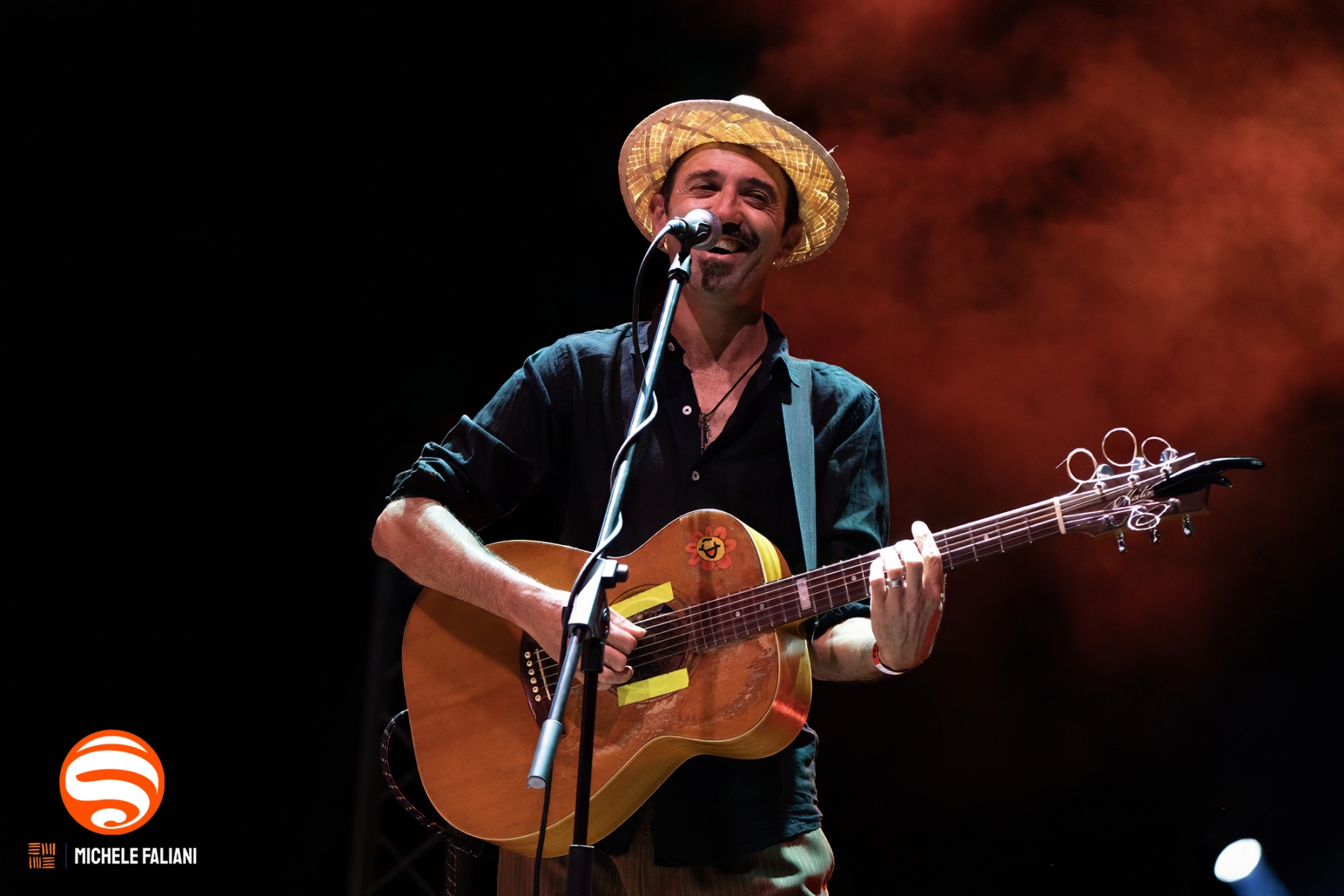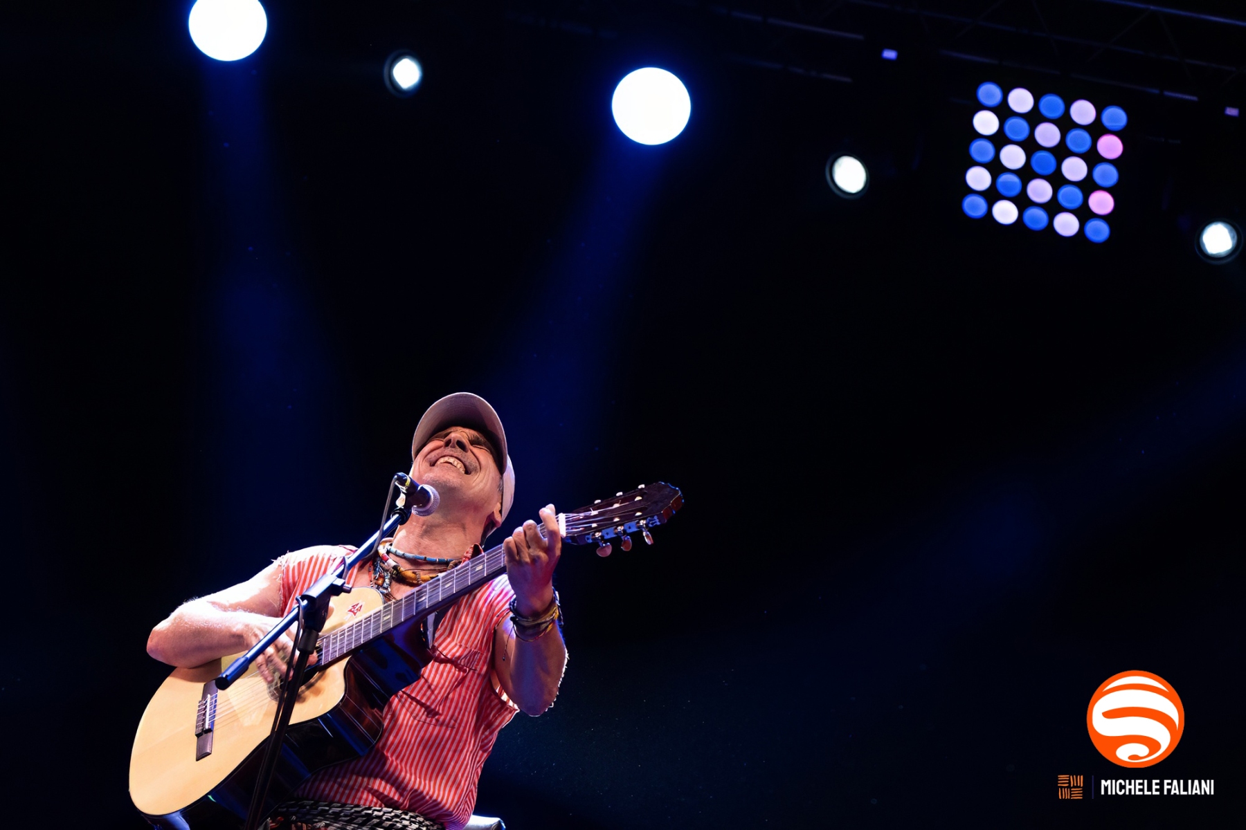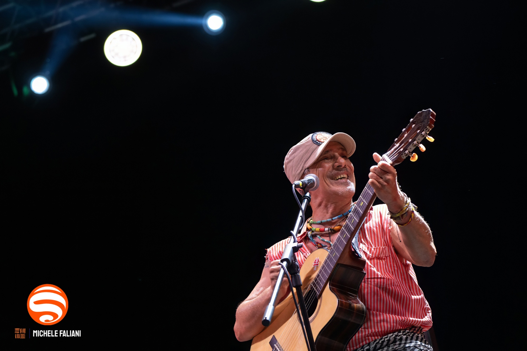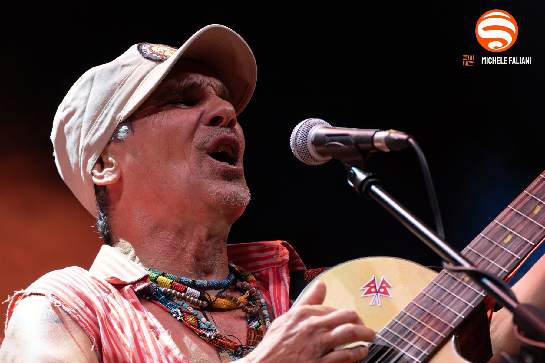 All’inizio il cantautore franco–ispanico parte morbido, quasi a voler prendere le misure al pubblico. Ma bastano pochi minuti perché la miccia si accenda: un crescendo di ritmi meticci, dalla rumba al reggae, dalla cumbia al rock, fino a far esplodere la folla in canti e danze sfrenate. Sul palco, solo lui, il percussionista e il chitarrista acustico: formazione essenziale, energia infinita.