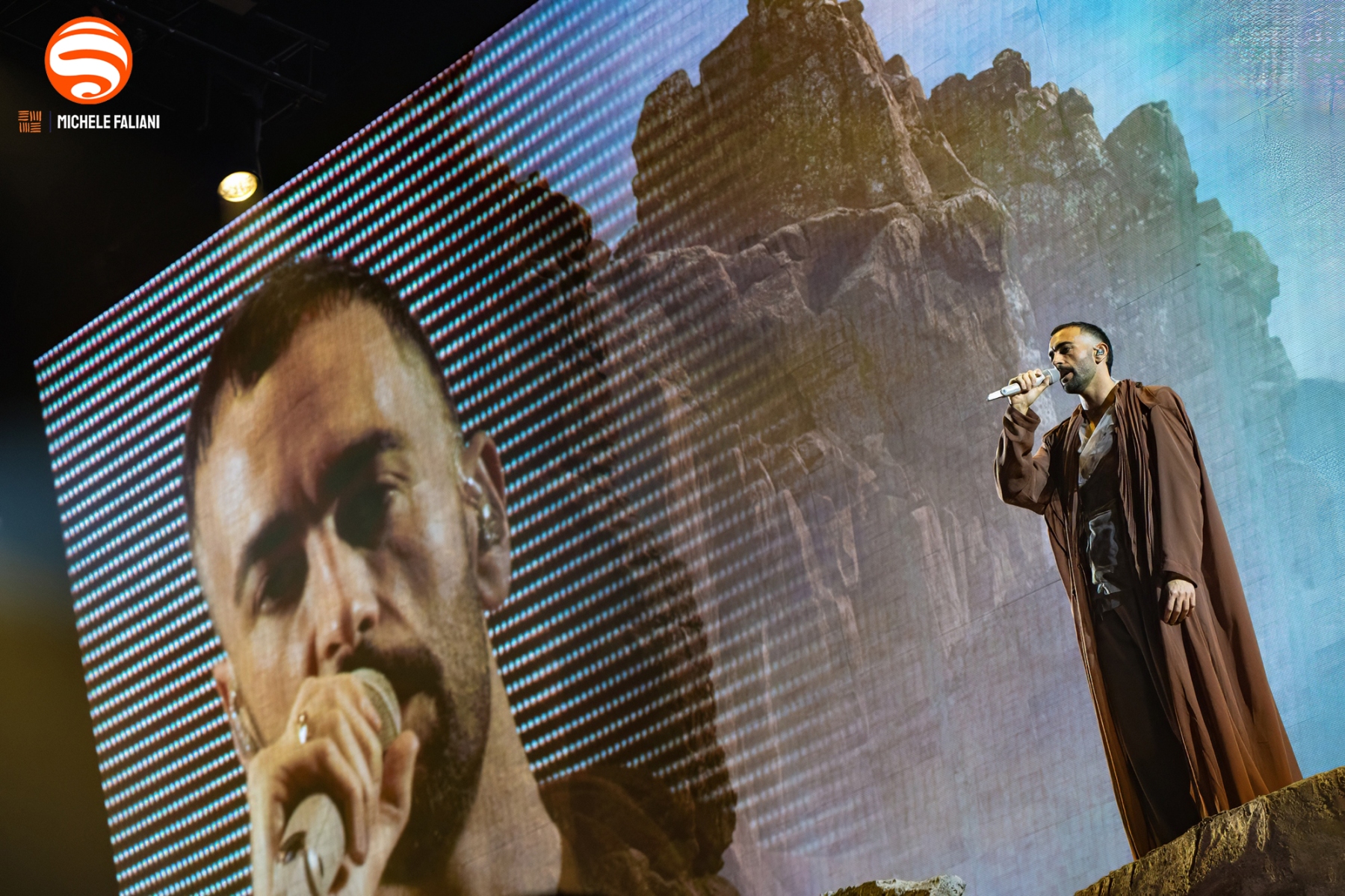 Appena l’arena sprofonda nell’oscurità, sulle pareti e sul palco compaiono scogliere e mare in tempesta, un’installazione visiva che trasforma Firenze in un paesaggio quasi mitologico. Mengoni emerge improvvisamente dalle rocce sceniche, come se si materializzasse dalla natura stessa, per aprire con “Ti voglio bene veramente”, “Guerriero” e “Sai che”. Il suo urlo “Ciao Firenze”, emesso dopo i primi brani, basta a innescare un boato che rimbalza sulle gradinate. La macchina però continua precisa, serrata: una scaletta di oltre trenta brani pensati al millimetro.