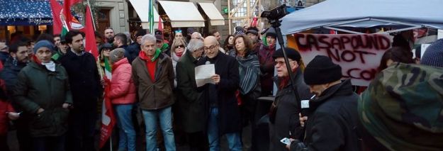 Centinaia le persone che a partire dalle ore 15 si sono presentate al presidio nella piazza di fronte al Municipio, dando spazio ad un susseguirsi di interventi e, per tutto il pomeriggio piazza Cavour si è animata con striscioni e bandiere tricolori e della sinistra.