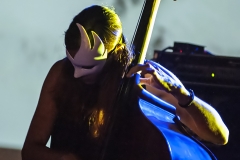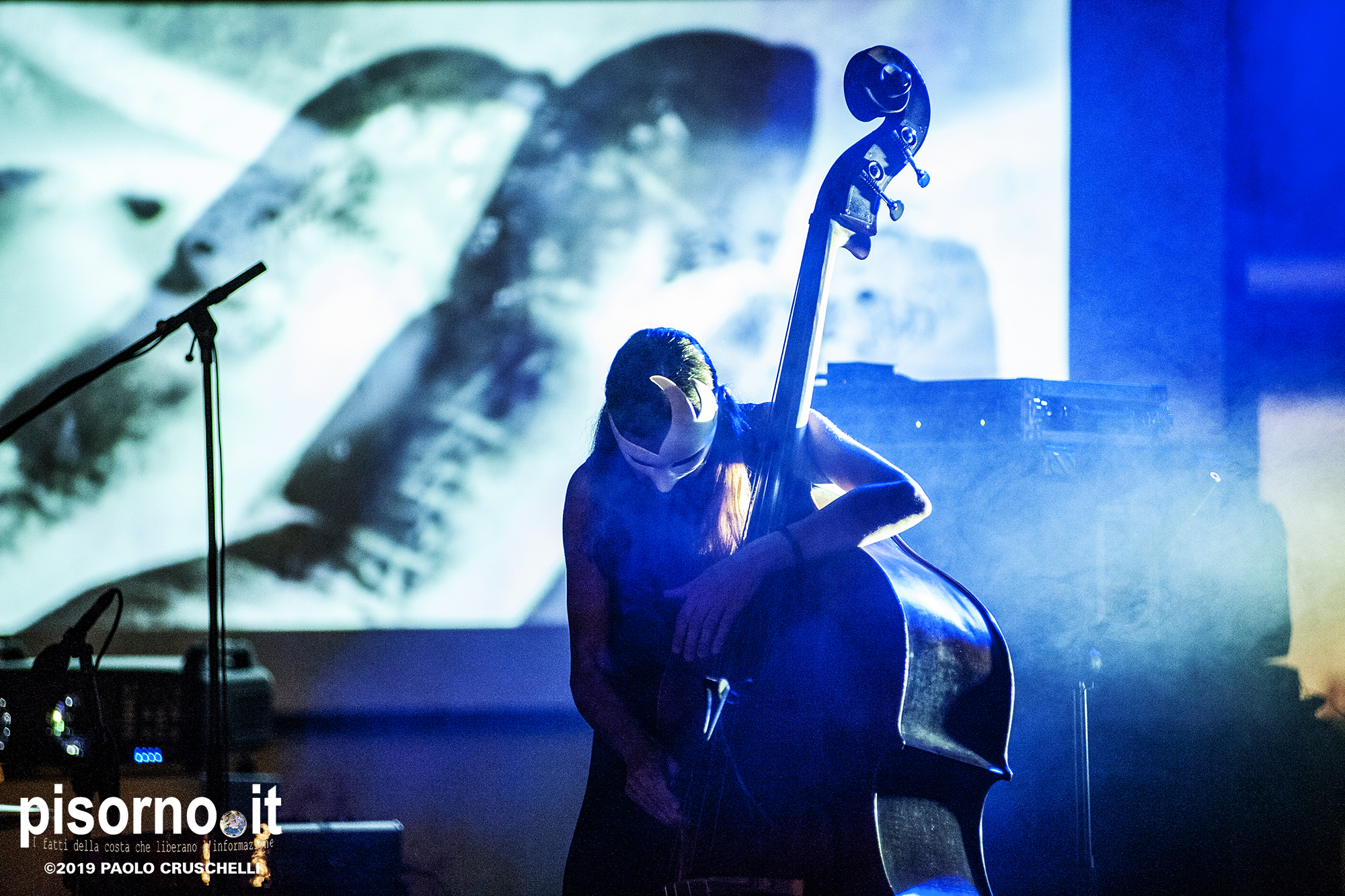 La performance comincia con un urlo, Caterina ha una maschera bianca e nera in viso e con il suo contrabbasso crea sonorità cupe e dark, con l’uso di loop ed elettronica crea tappeti sonori ipnotici, ogni brano è accompagnato da una video installazione e dedicato agli attori che nei vari progetti cinematografici hanno impersonato Dracula.