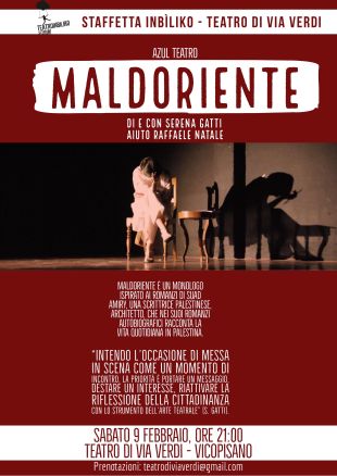 Sabato 9 febbraio 2019 alle ore 21.00 al Teatro di Via Verdi – Vicopisano, all’interno della rassegna Staffetta In Bìliko andrà in scena Maldoriente, un monologo prodotto da Azulteatro liberamente ispirato ai romanzi di Suad Amiry, di e con Serena Gatti, assistenza alla regia Raffaele Natale.
