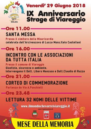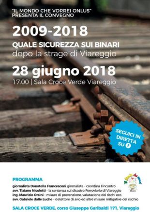 L’Associazione dei familiari delle vittime della strage di Viareggio “Il Mondo che vorrei” ha organizzato, per il giorno 28 giugno 2018, alle ore 17,00 presso la Sala Croce Verde di Viareggio, in Corso Garibaldi 171, nell’ambito delle iniziative per la ricorrenza del 9° anno dal disastro ferroviario che ha causato 32 vittime e centinaia di feriti, un convegno pubblico per fare il punto sulla sicurezza ferroviaria “2009-2018: quale sicurezza, sui binari dopo la strage di Viareggio”.