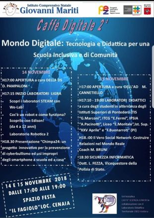L’Istituto Comprensivo G. Mariti di Fauglia è lieto di presentare la seconda edizione del Caffè Digitale, che si terrà Mercoledì14 e Giovedì 15 Novembre presso lo Spazio Festa “Il Fagiolo” di Cenaia dalle ore 17.00 alle ore 19.00.